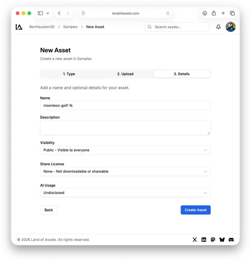 You can try it from any project’s Assets page: create or open a project, then use New Asset to run through the wizard. Get started with an account or browse the Asset Library first.